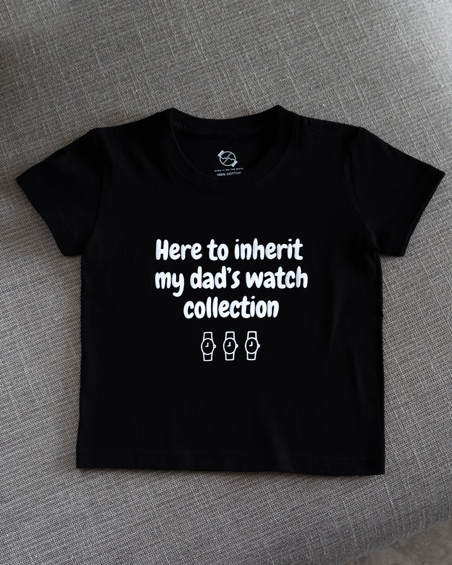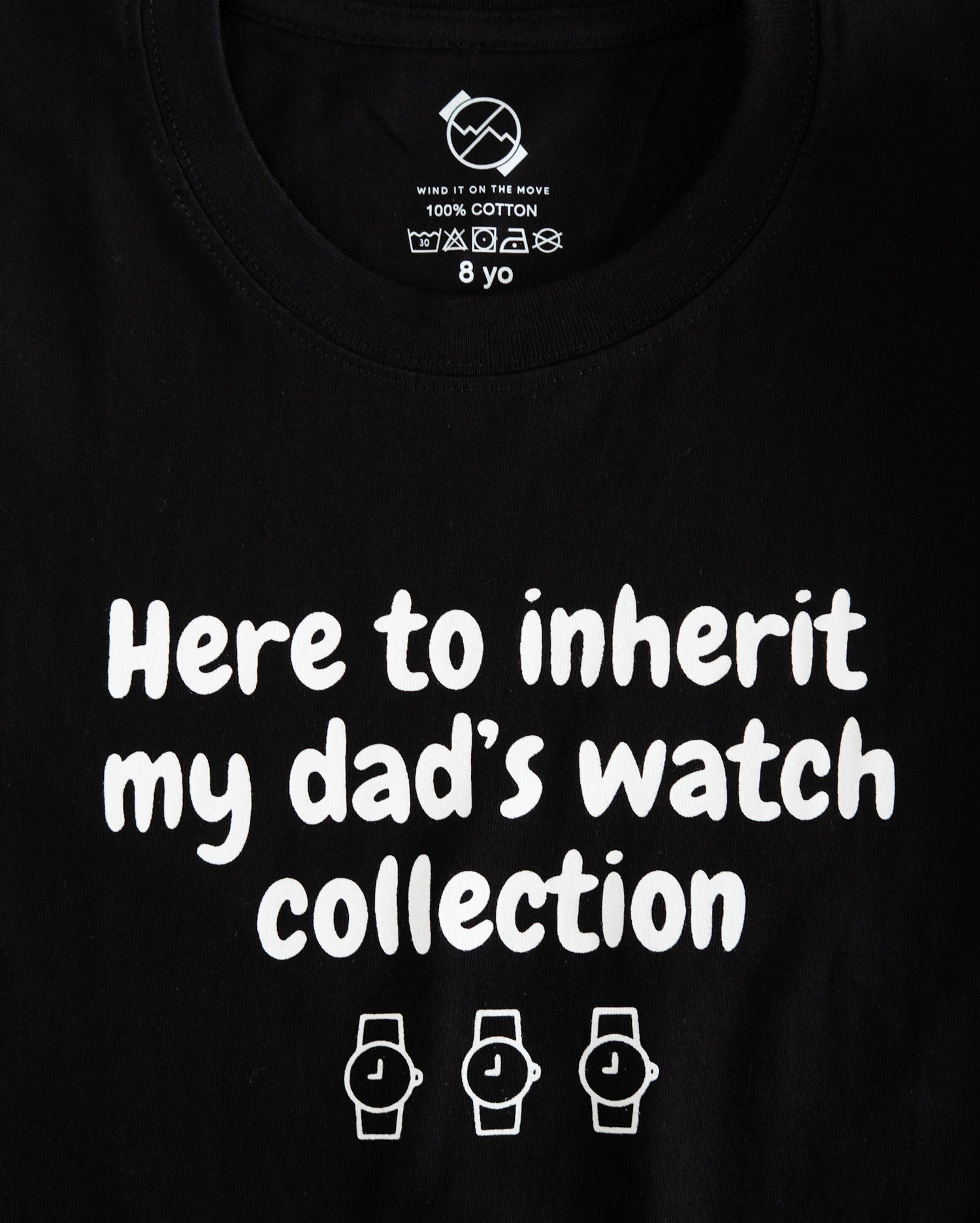 A fun, comfy tee ages 2 to 9. With a playful saying, it adds humor to your child's wardrobe, celebrating their connection to watch-loving dads. Made from top-quality materials and available in various sizes, it's a versatile and stylish addition to any kid's wardrobe. Plus, it makes a unique and thoughtful gift for watch enthusiast parents. Get one today and let your little one proudly carry on the family's horological tradition!